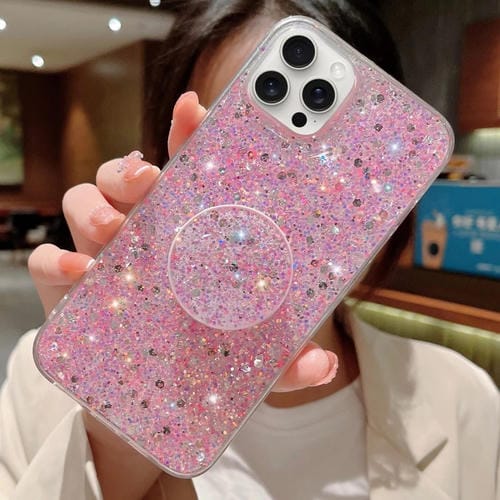 Funda para teléfono TPU Epoxi iPhone 12 Pro con soporte redondo y Lentejuelas estrelladas (Rosa)