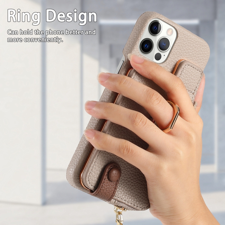 Funda Trasera para iPhone 12 Pro con billetera, cremallera y anillo de cuero litchi (Caqui)
