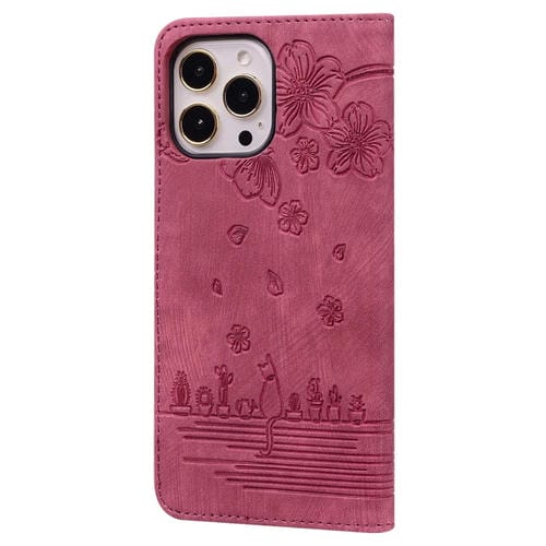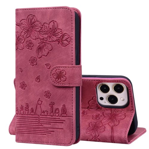 Estuche de Cuero para iPhone 12 Pro Max Cartoon Sakura Cat En Relieve (Rojo Vino)