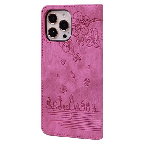 Estuche para iPhone 12 Pro Max Cartoon Sakura Cat de Cuero en Relieve (Rose Red)