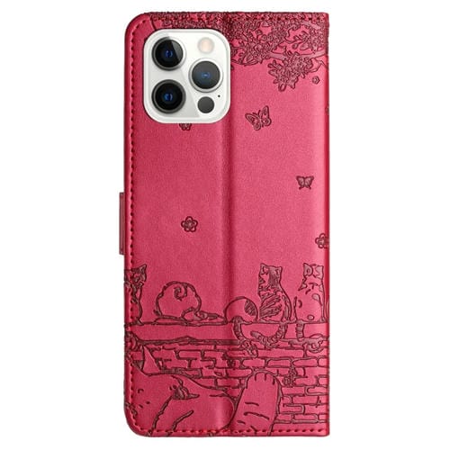 Estuche de teléfono iPhone 12 Pro Max Cat cuero con patrón de relieve y cordón (Rojo)