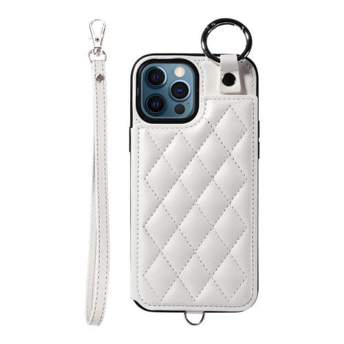 For iPhone 12 Pro Max Phone Case with Rhombic Texture Card Bag and Short Lanyard (White)