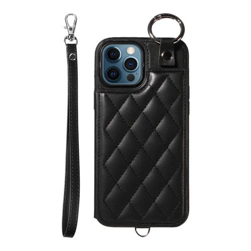For iPhone 12 Pro Max Phone Case with Rhombic Texture Card Bag and Short Lanyard (Black)