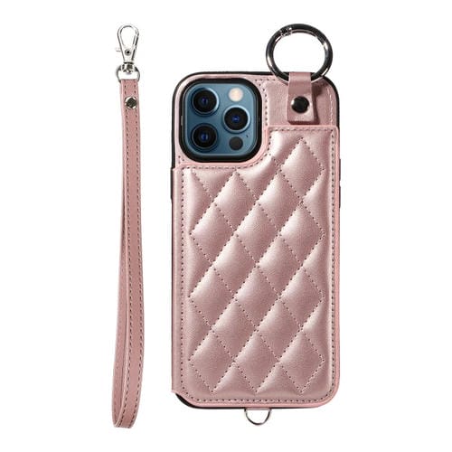 For iPhone 12 Pro Max Phone Case with Rhombic Texture Card Bag and Short Lanyard (Rose Gold)
