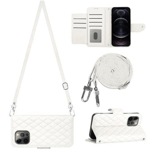 Funda para Teléfono iPhone 12 Pro Max Cuero Textura Rómbica Tapa Cordón Largo (Blanco)