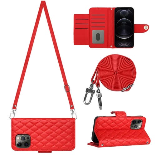 Funda para Teléfono iPhone 12 Pro Max con Tapa de Cuero Textura Rómbica y Cordón Largo (Rojo)