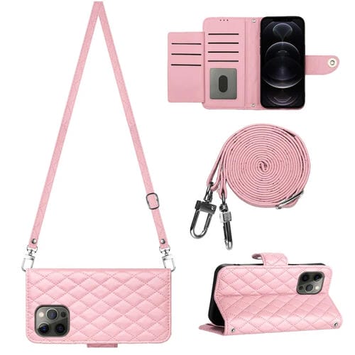 Funda para Teléfono iPhone 12 Pro Max con Tapa de Cuero Textura Rómbica y Cordón Largo (Rosa)