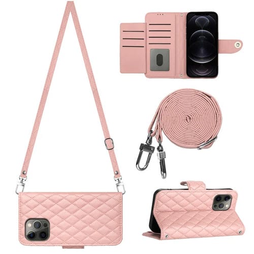 Funda para Teléfono iPhone 12 Pro Max con Tapa de Cuero Textura Rómbica y Cordón Largo (Rosa Coral)