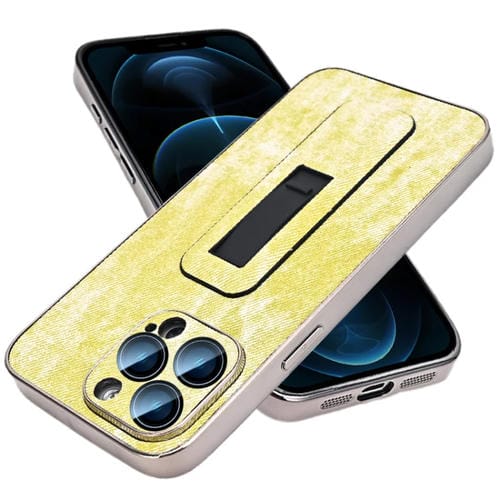 Caja de Teléfono de Enfriamiento para iPhone 12 Pro Max Patrón de Mezclilla con Soporte Push-Pull Galvanizado (Amarillo Verde)
