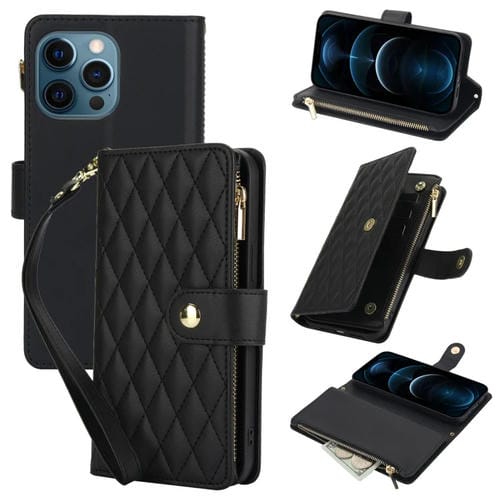 Pour iPhone 12 Pro Max YM016 Étui de téléphone portefeuille en cuir à fermeture éclair rhombique avec lanière (noir)
