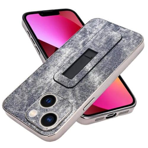 Funda de teléfono para iPhone 13 con enfriamiento y soporte push-pull galvanizado con patrón de mezclilla (Gris Azul)