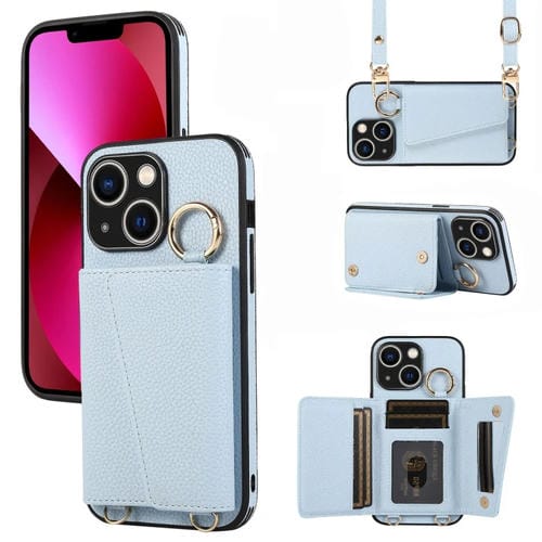 Funda para Teléfono iPhone 13 Contraportada de Cuero con Billetera y Anillo Cruzado (Azul)