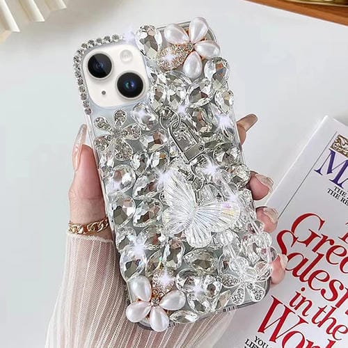 Funda para teléfono iPhone 13 con incrustaciones de diamantes y mariposas hecha a mano (Blanco)