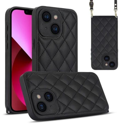Funda para Teléfono iPhone 13 Textura Rómbica Cordón Doble (Negro)