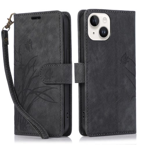 For iPhone 13 Orchid Butterfly Embossed Leather Phone Case (Black)