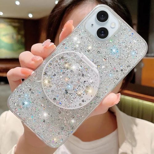 Funda para Teléfono TPU Epoxi iPhone 13 con Soporte Espejo Redondo Lentejuelas Estrelladas (Plateado)