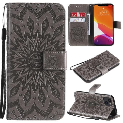 Funda para iPhone 13 Cuero PU Flip Horizontal Patrón Girasol Ranuras Tarjetas Billetera Cordón (Gris)