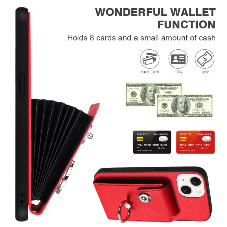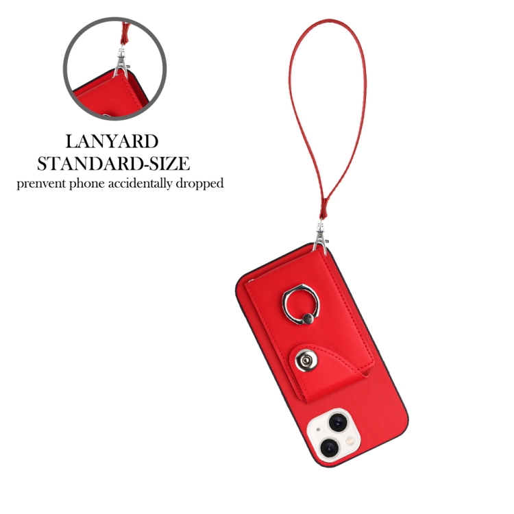 For iPhone 13 mini PU Phone Case with Ring Holder and Organ Card Bag with Lanyard (Red)