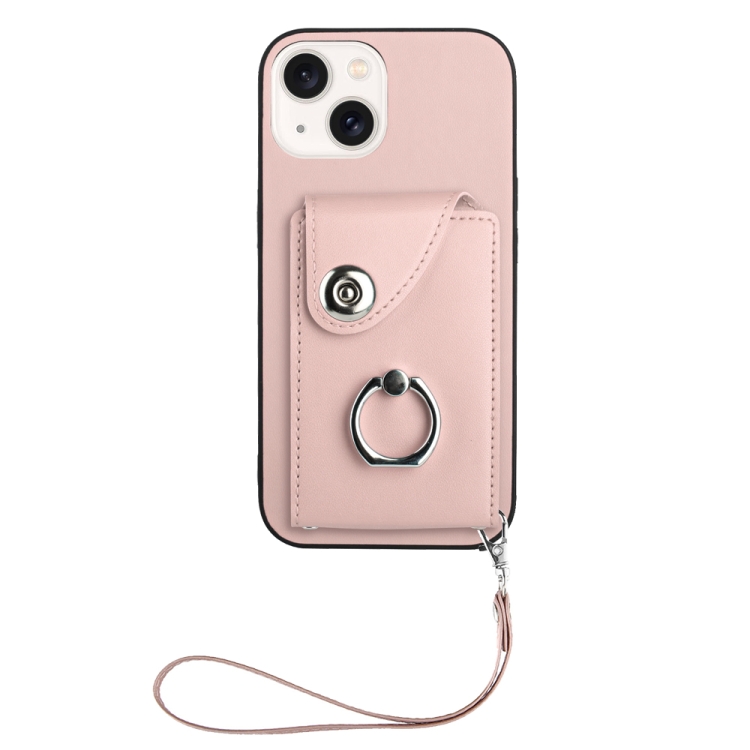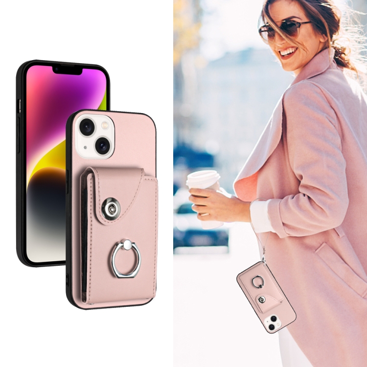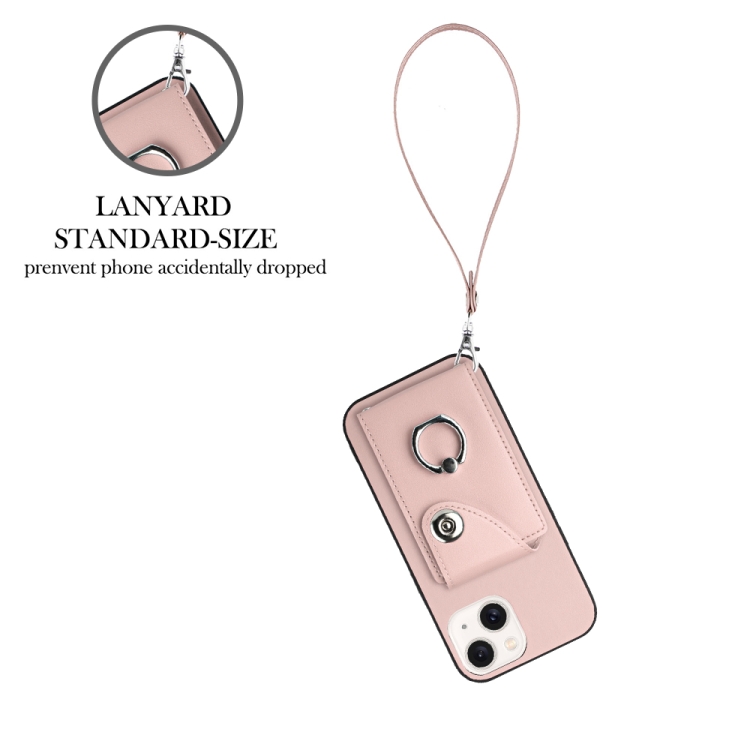 For iPhone 13 mini PU Phone Case with Ring Holder and Organ Card Bag with Lanyard (Pink)