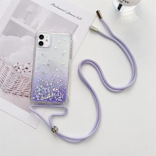 Estuche TPU para iPhone 13 Mini Gradient Glitter Powder Epoxy a prueba de golpes con acrílico engrosado y cordón de cuello (Púrpura)