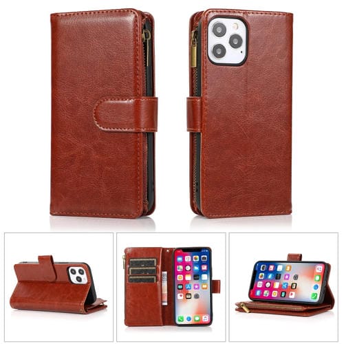 Funda de Cuero para iPhone 13 Crazy Horse Texture Multifuncional con Tapa Horizontal, 9 Ranuras para Tarjetas, Soporte, Billetera con Cremallera y Cordón (Marrón)