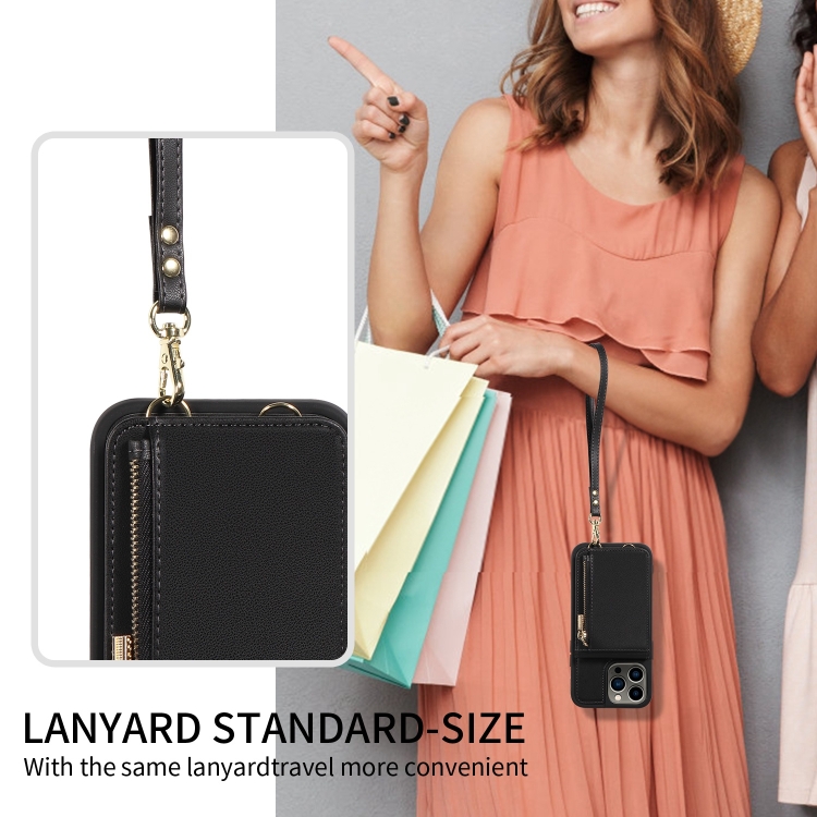 Funda de Cuero para Teléfono iPhone 13 Pro Crossbody Lanyard Zipper Wallet (Negro)