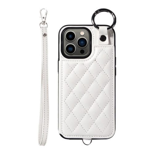 Estuche para Teléfono iPhone 13 Pro Bolsa para Tarjetas Textura Rómbica Cordón Corto (Blanco)