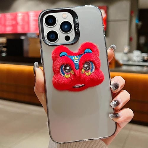 For iPhone 13 Pro New Year Lion Dance Plush Doll Phone Case (Red Lion with Gray Back)