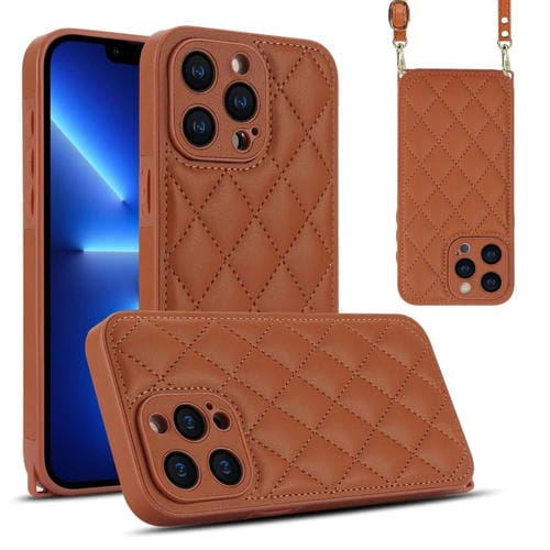 Estuche para Teléfono iPhone 13 Pro Textura Rómbica con Cordón Doble (Marrón)