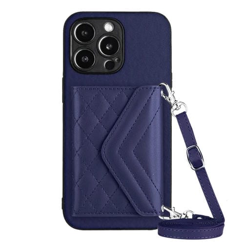 Estuche para Teléfono iPhone 13 Pro Rfid con Bolsa para Tarjetas Textura Rómbica y Cordón Largo (Púrpura Oscuro)