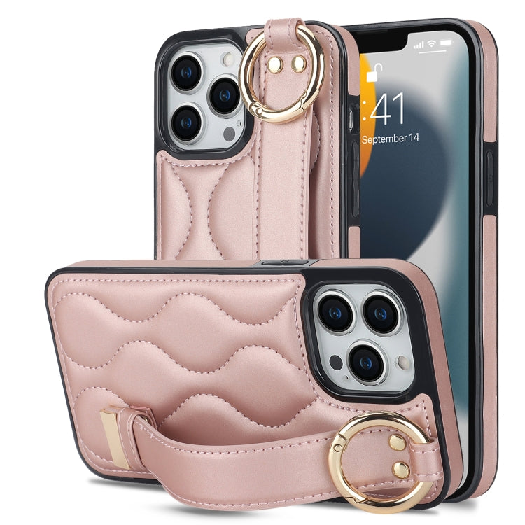 Pour iPhone 13 Pro Étui de téléphone en PU avec anneau de couverture complète antidérapant avec bracelet (or rose)