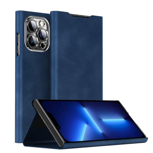 Funda magnética para iPhone 13 Pro de cuero con textura de Napa y soporte (Azul)