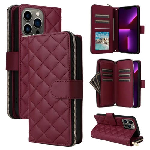 Funda para Teléfono iPhone 13 Pro Cuero Hebilla Torre Cremallera Rombal Cruzada Cordón (Rojo Vino)