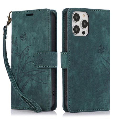 For iPhone 13 Pro Orchid Butterfly Embossed Leather Phone Case (Green)
