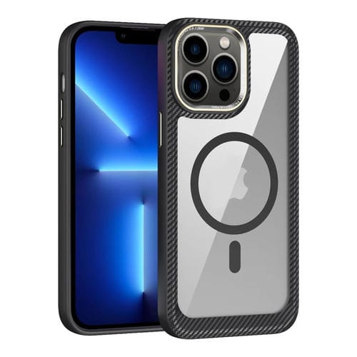 Caja de Teléfono para iPhone 13 Pro Magsafe con Panel Posterior Transparente de Fibra de Carbono (Negro)