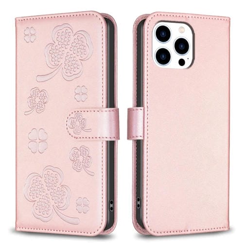 Funda para Teléfono iPhone 13 Pro Max Cuero con Relieve de Cuatro Hojas (Rosa)