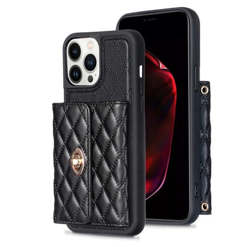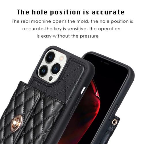 Funda para iPhone 13 Pro Max Horizontal Metal Hebilla Monedero Rombico Cuero (Negro)