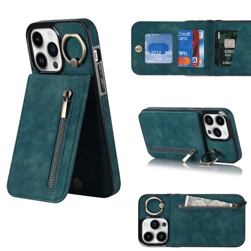 Pour iPhone 13 Pro Max Anneau rétro et fermeture à glissière Étui de téléphone avec fente pour carte RFID (Bleu)