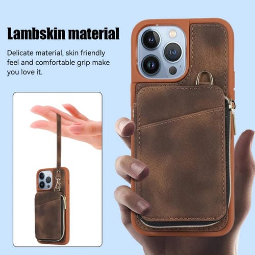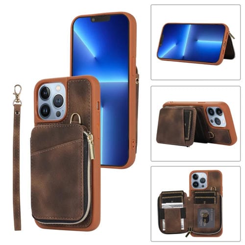 Pour iPhone 13 Pro Max Zipper Card Bag Couverture arrière Étui de téléphone (Marron)