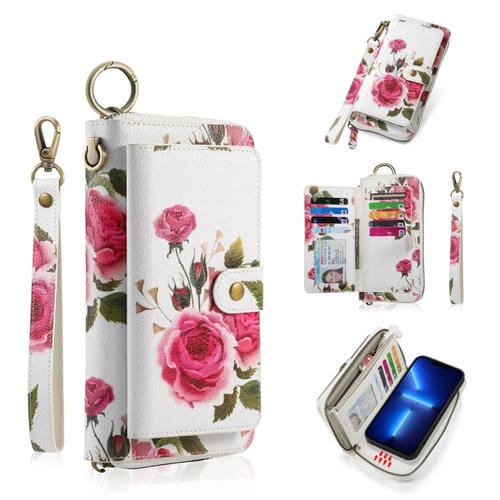 Funda de Cuero Pola Magsafe Flower para iPhone 13 Pro con Billetera y Cremallera Multifuncional (Beige)
