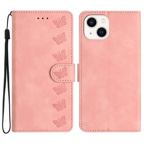 Caja de Teléfono para iPhone 13 Seven Butterflies Cuero en Relieve (Rosa)