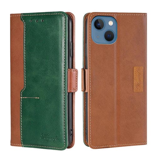 Caja de Teléfono iPhone 14 Cuero con Hebilla Lateral Color de Contraste (Marrón Claro + Verde)