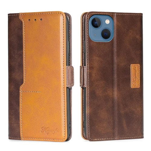 Caja de Teléfono de Cuero para iPhone 14 con Hebilla Lateral y Color de Contraste (Marrón Oscuro + Dorado)
