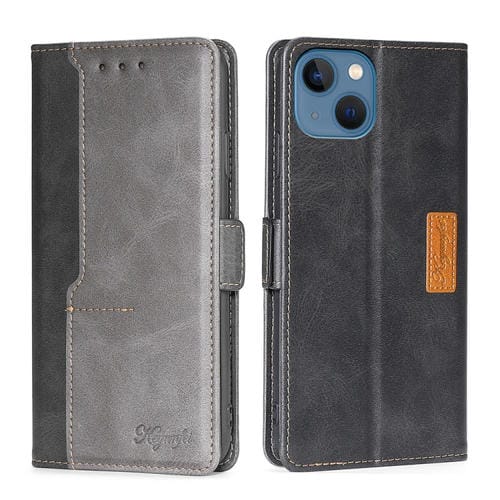 Caja de teléfono de cuero para iPhone 14 con hebilla lateral y color de contraste (Negro + Gris)