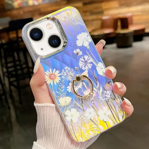Funda para iPhone 14 TPU con Soporte de Anillo y Flor Láser de Galvanoplastia (Crisantemo Ah5)