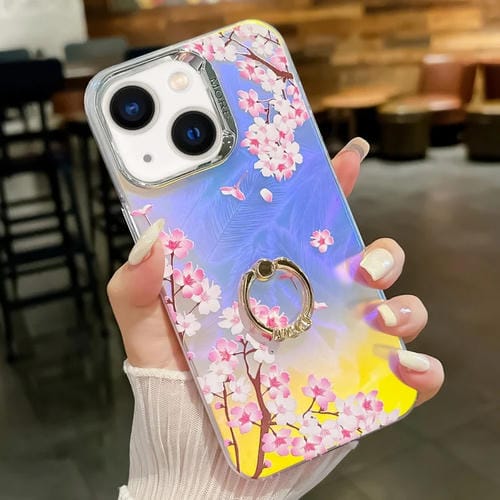 Funda para iPhone 14 TPU con Soporte de Anillo Flor Láser Galvanoplastia (Flor de Melocotón)