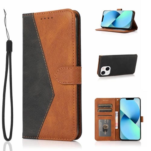 Estuche para teléfono iPhone 14 de cuero con costuras de dos colores (Marrón Negro)