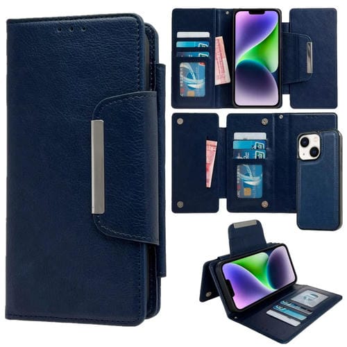 Funda de Cuero para Teléfono iPhone 14 con Billetera Multifuncional para 7 Tarjetas (Azul Real)