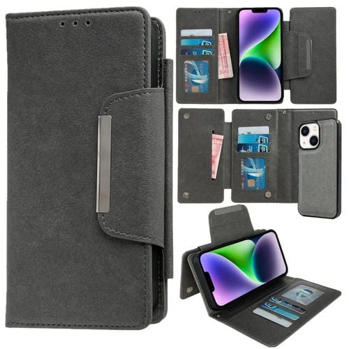 Funda de Cuero para Teléfono iPhone 14 con Billetera Multifuncional para 7 Tarjetas (Gris)