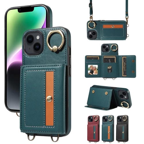 Funda para Teléfono iPhone 14 Cuero con Soporte para Anillo y Bolso Cruzado para Tarjeta (Verde)